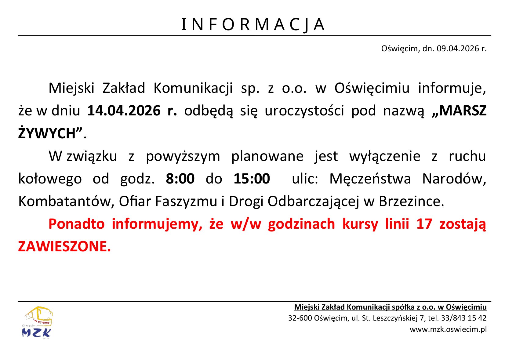 Miejski Zakład Komunikacji sp. z o.o. w Oświęcimiu informuje, że w dniu 14.04.2026 r. odbędą się uroczystości pod nazwą „MARSZ ŻYWYCH”. W związku z powyższym planowane jest wyłączenie z ruchu kołowego: • od godz. 8:00 do 15:00 ulicy St. Leszczyńskiej w Oświęcimiu, ulic: Męczeństwa Narodów, Kombatantów, Ofiar Faszyzmu i Drogi Odbarczającej w Brzezince.