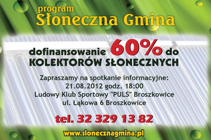 Spotkanie informacyjne w sprawie 60% dofinansowania zakupu kolektorów słonecznych - 21 sierpnia 2012, godz. 18:00 LKS "Puls"